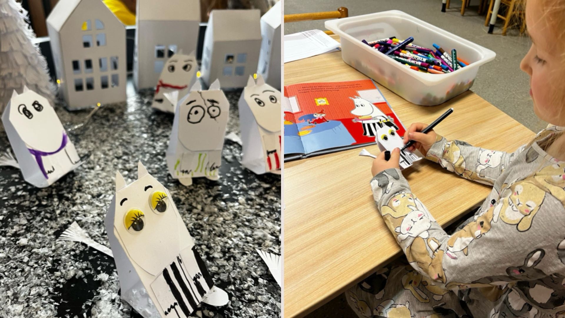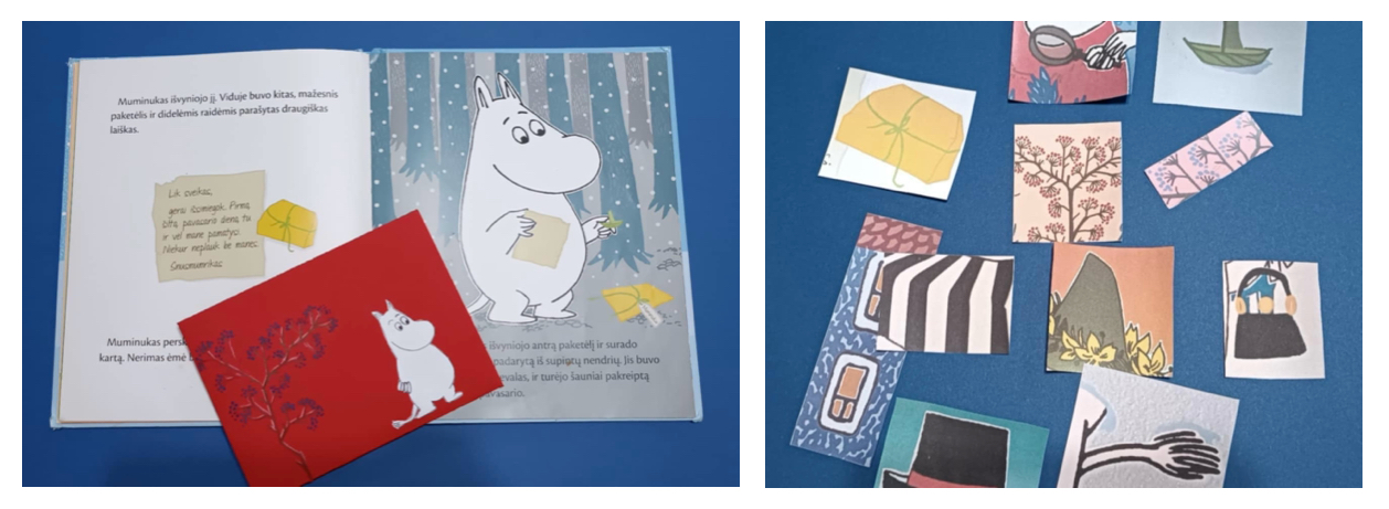 Knygos iliustracijos – laiškas, laivelis, namai, sniego gniūžtės, kakava – tapo neišsemiamu kūrybinio įkvėpimo šaltiniu. Vaikai mokėsi rašyti laišką, aiškinosi, kaip reikėtų jį išsiųsti, lipdė Muminukų slėnį, kuriuo buvo puošiamos darželio erdvės. Skaitymo derinimas su kūrybinėmis veiklomis padėjo vaikams geriau įsisavinti knygos turinį, ilgiau išlaikyti dėmesį ir įsiminti skaitytą istoriją.