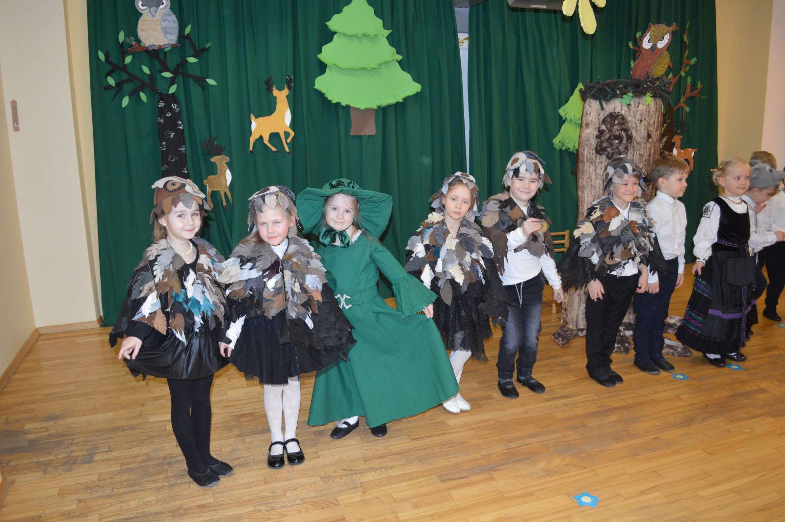 Prie interaktyvaus ekrano tyrinėjome pelėdos išvaizdą. Aiškinomės, kad pelėdos turi dideles akis, mažą snapą ir didelius sparnus. Vaizdavome, kaip skraido pelėdžiukai. Bandėme imituoti pelėdos skleidžiamus garsus. Aptarėme, kuo pelėdos minta. Mokėmės komandinio darbo bandydami pasiskirstyti vaidmenimis, konstruoti vaidinimo dekoracijas. Į grupę atsinešėme kartoninių dėžių, putplasčio, spalvoto popieriaus ir kt. Visi kibome į darbą: karpėme, dažėme, kūrėme medžius, konstravome pelėdų lizdą iš šakelių, gaminome raides A ir B iš putplasčio, jas dekoravome gėlėmis. Į procesą įtraukėme ir tėvus. Su tėvais aptarėme galimybes paruošti vaikams kostiumus, parengti kitos atributikos.